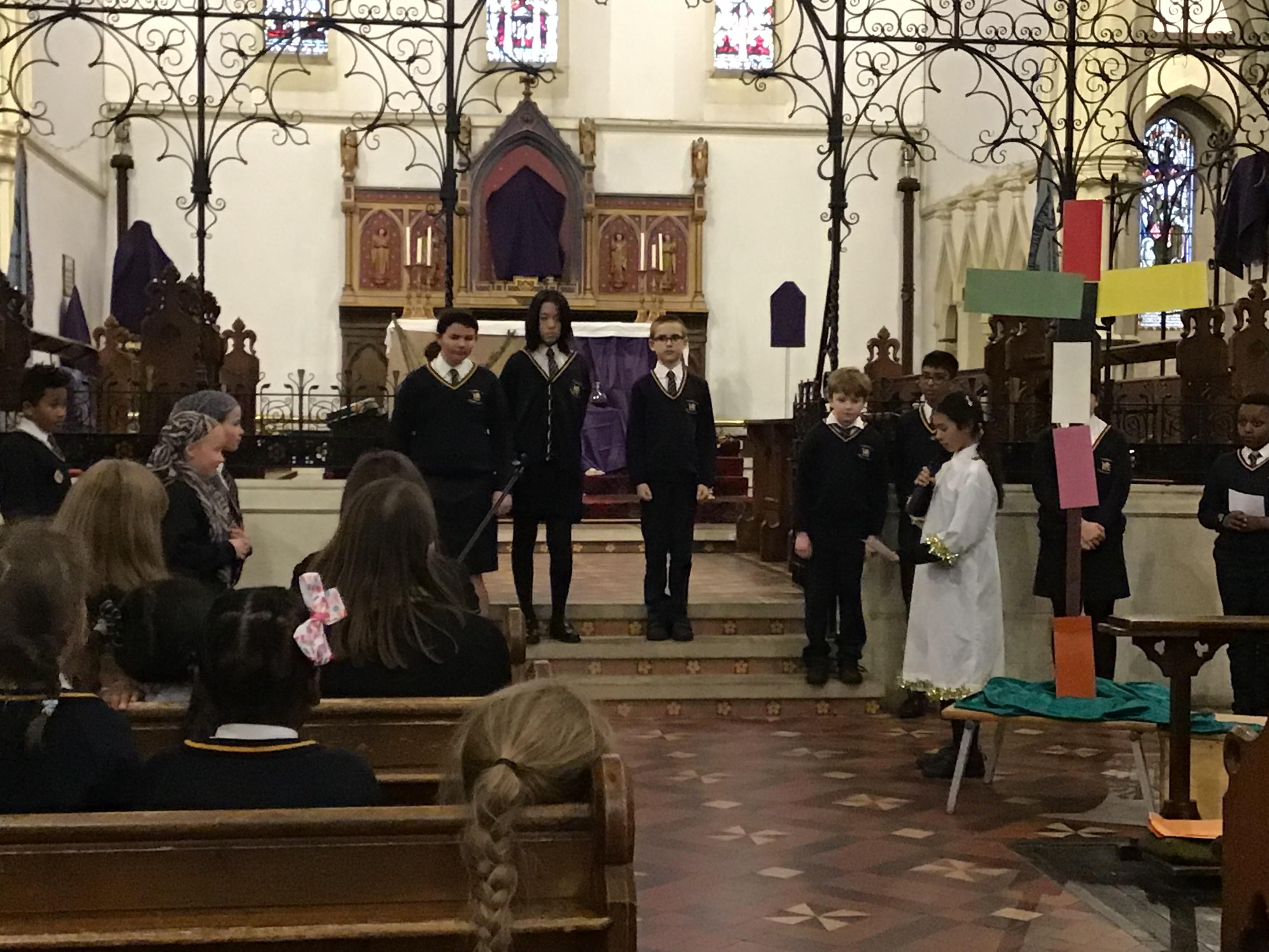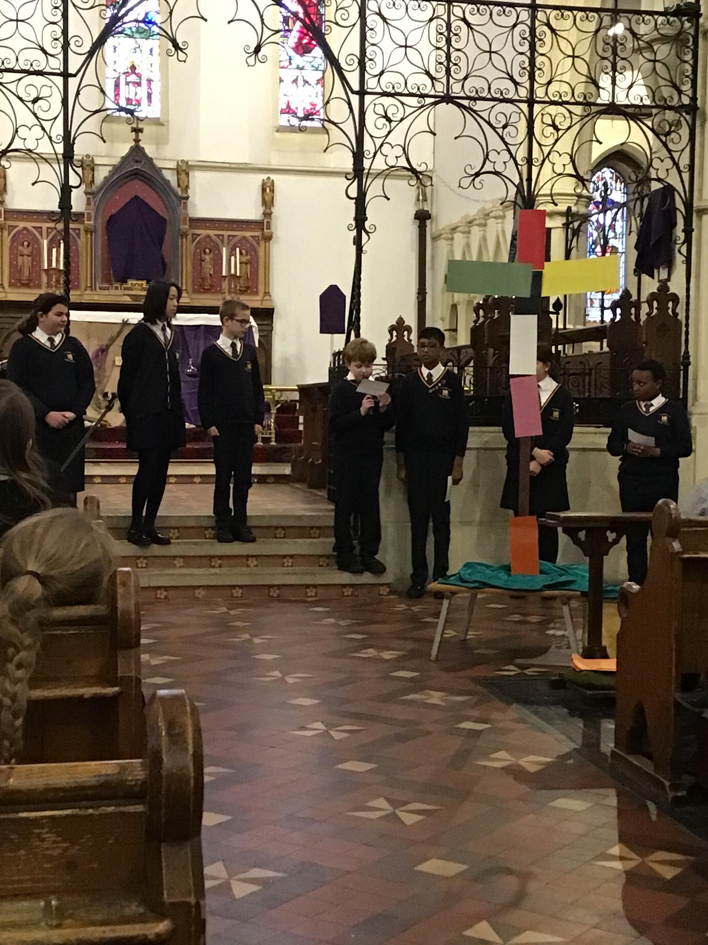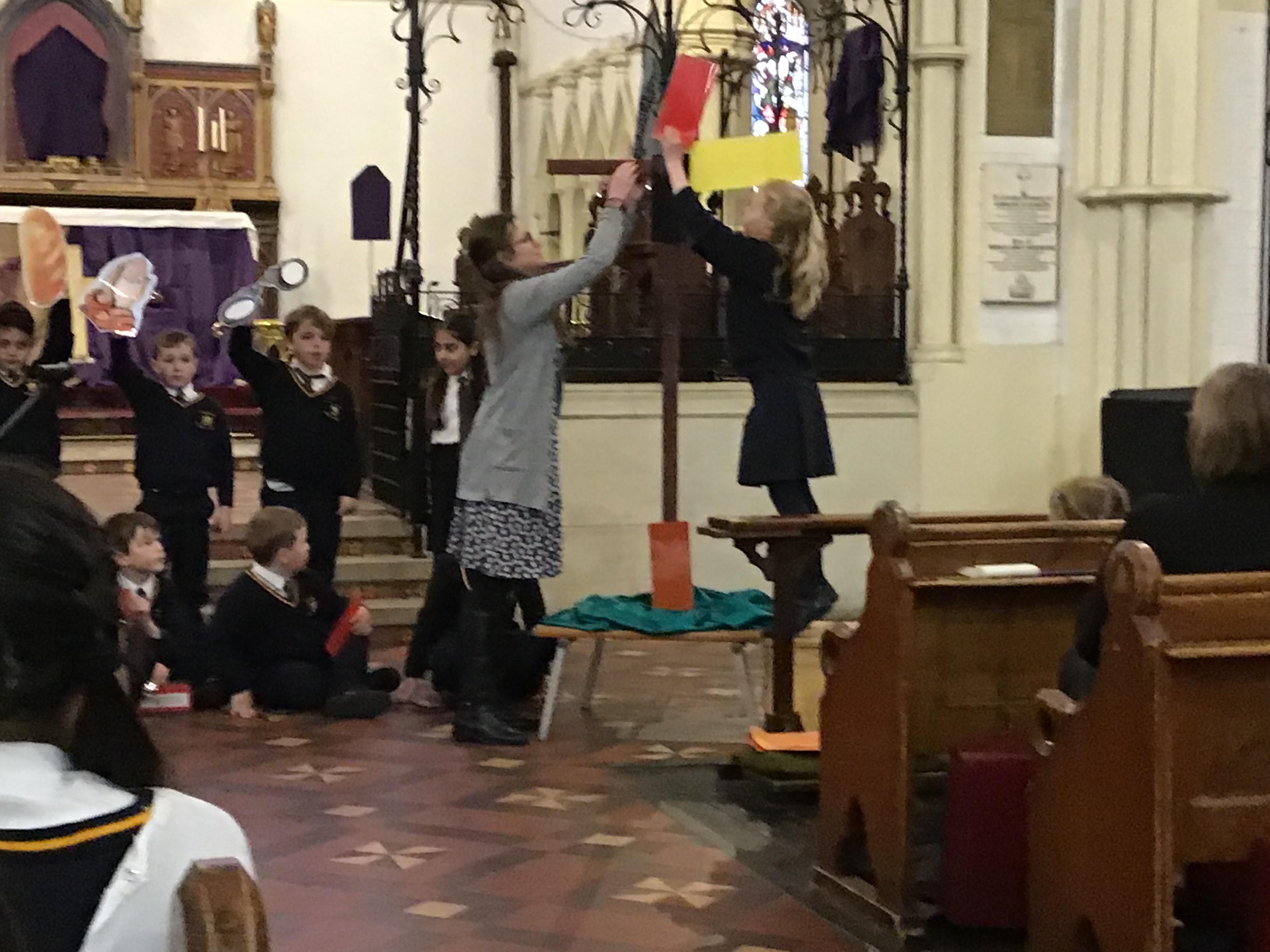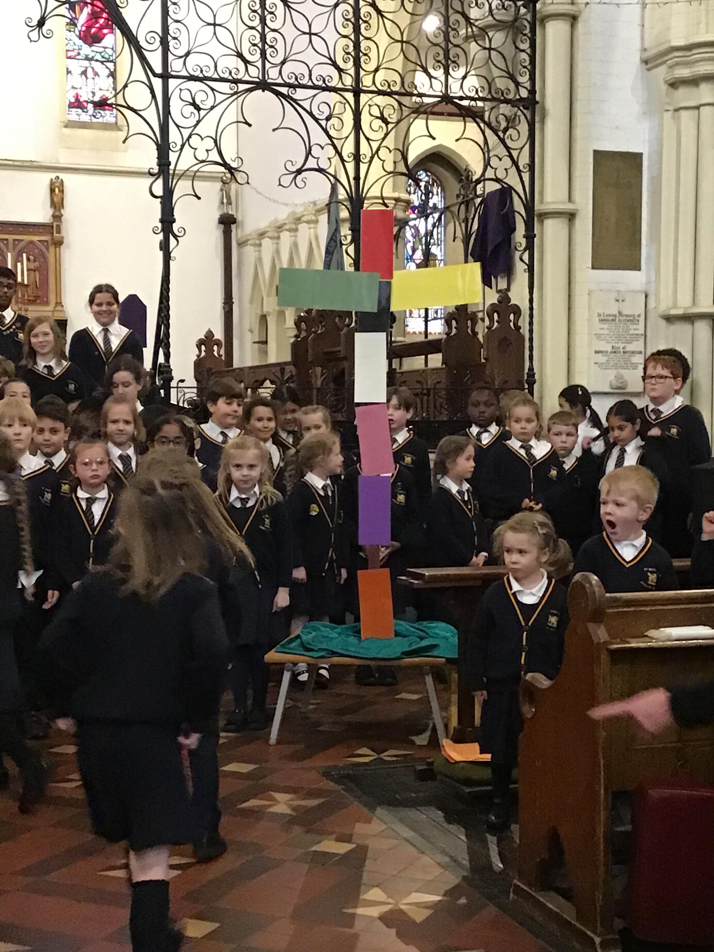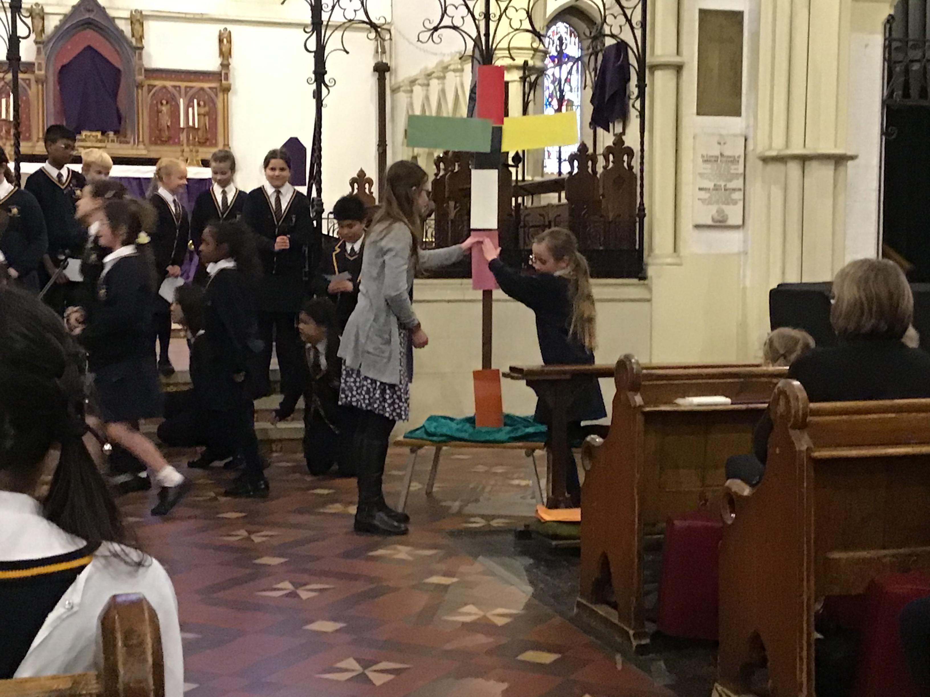 Each class took a colour and represented aspects of Jesus' life using poems, stories, drama and Bible readings. The colours were added to the cross making a visual reminder of each part.