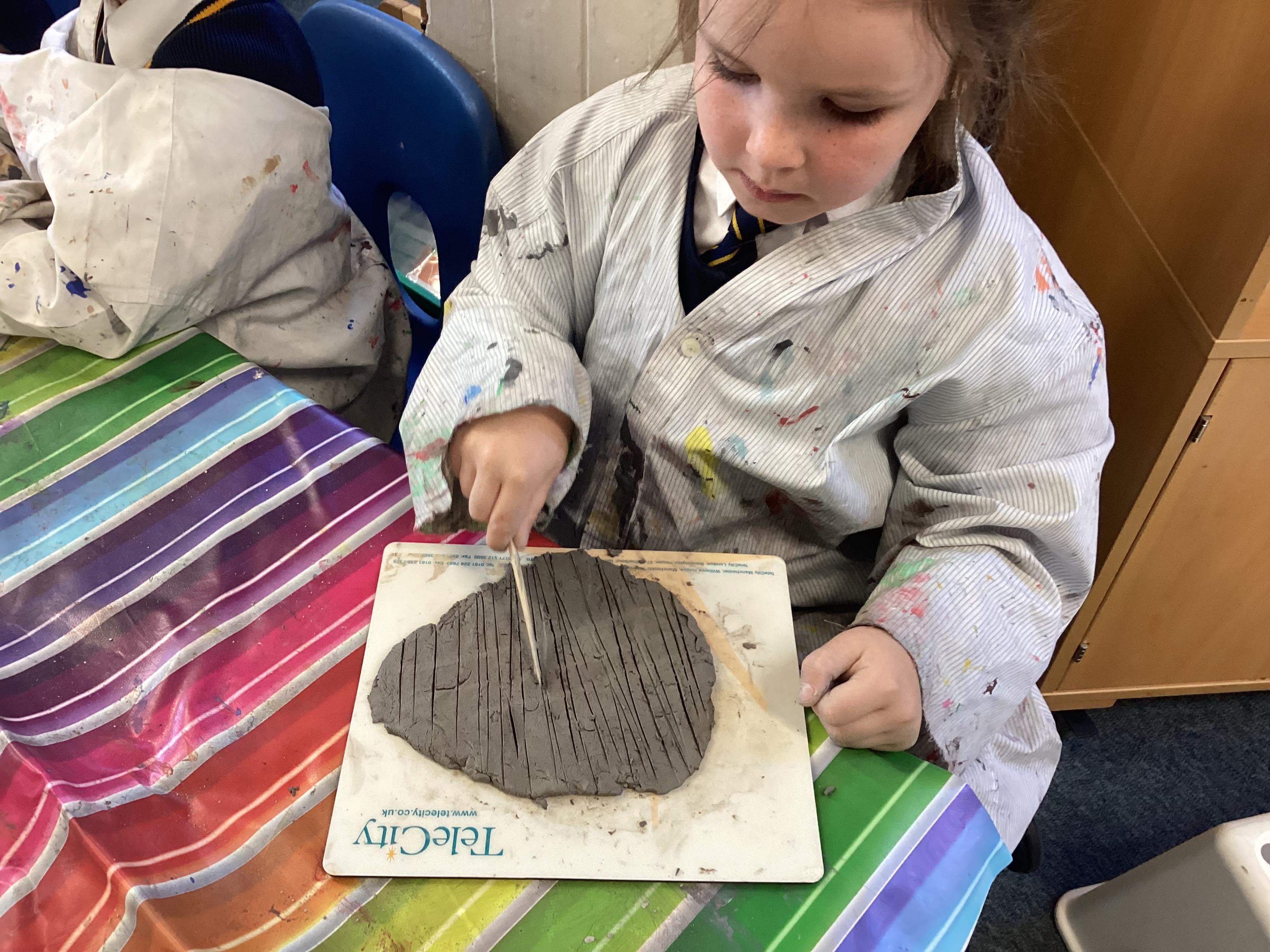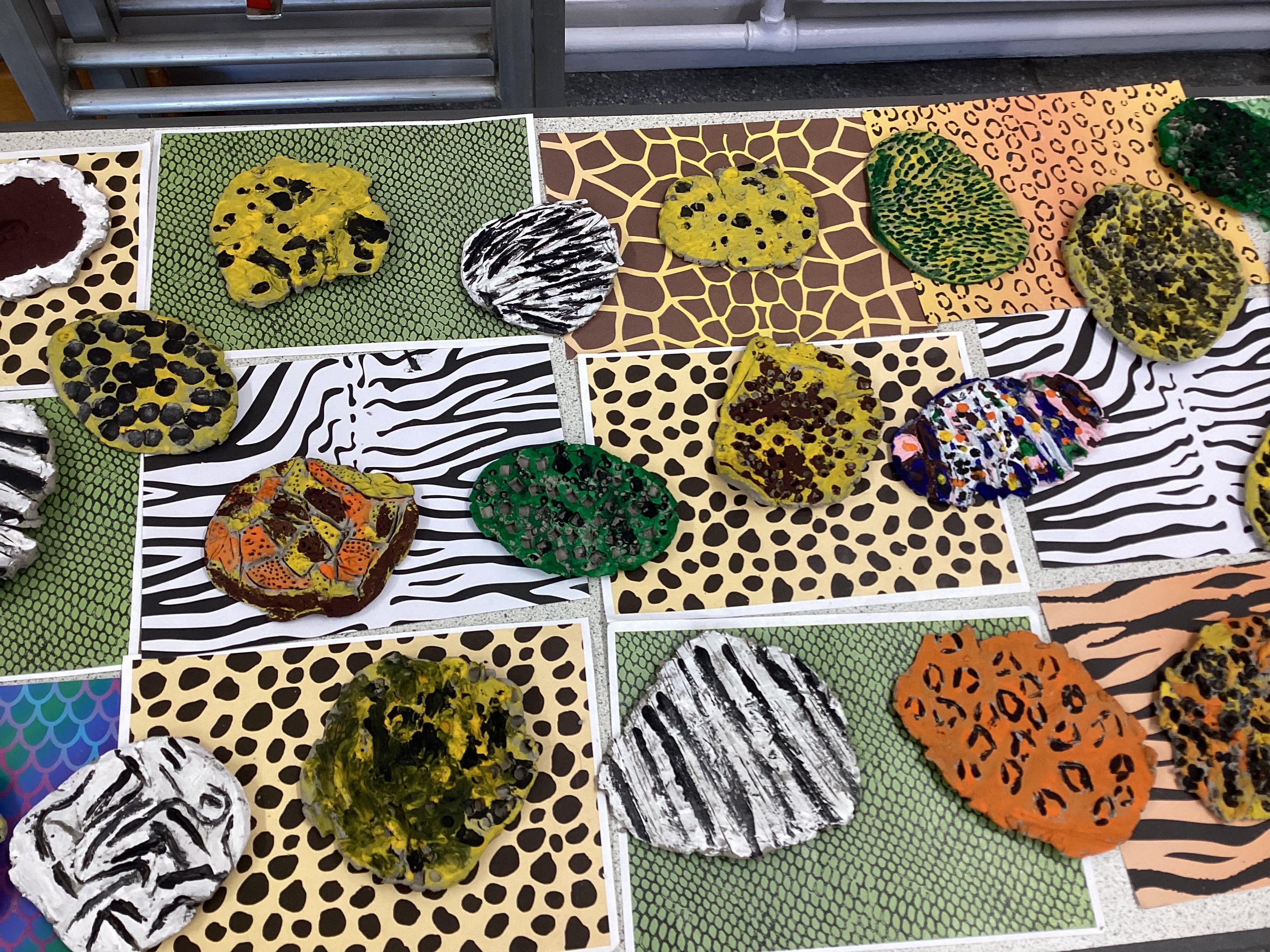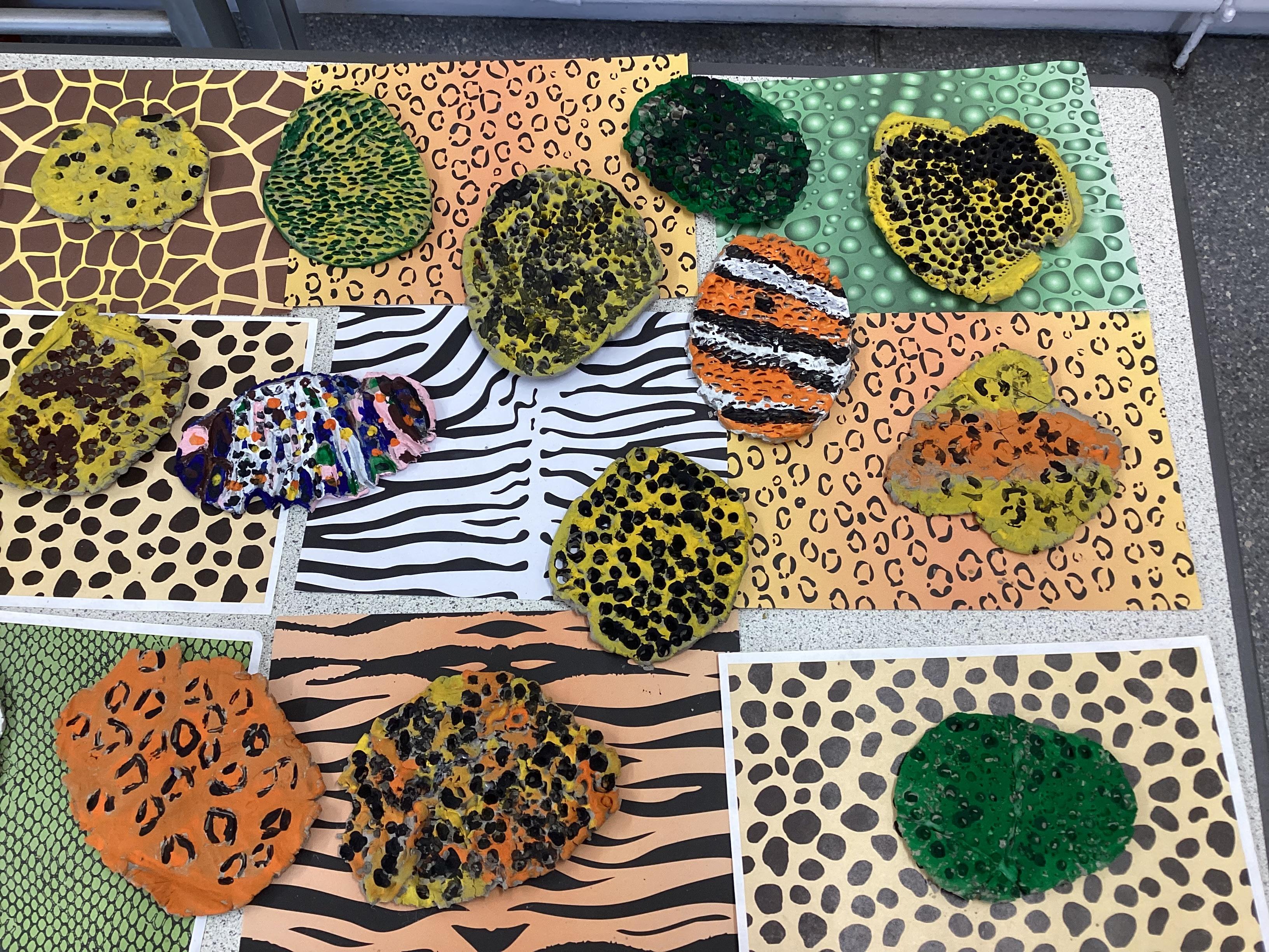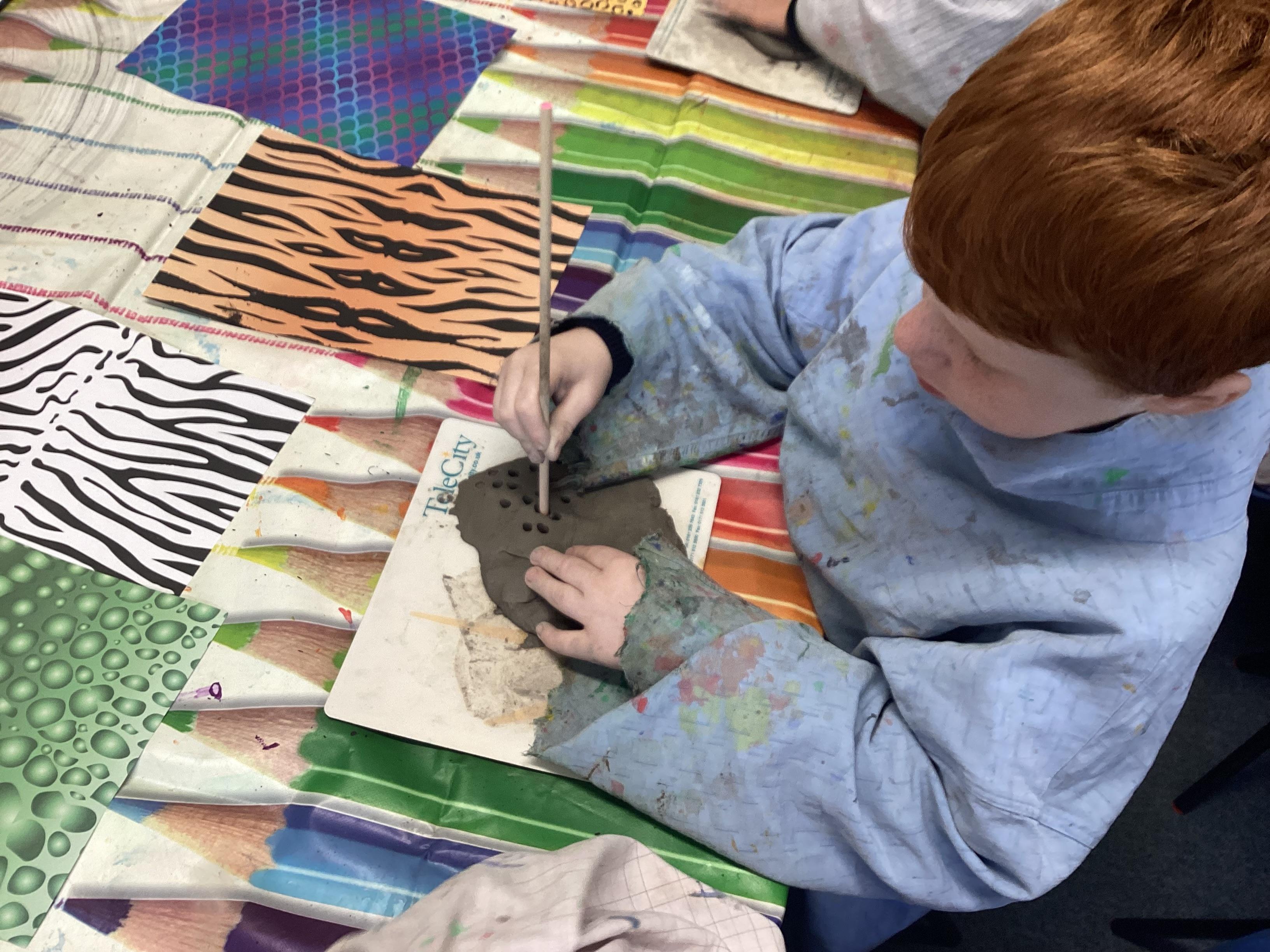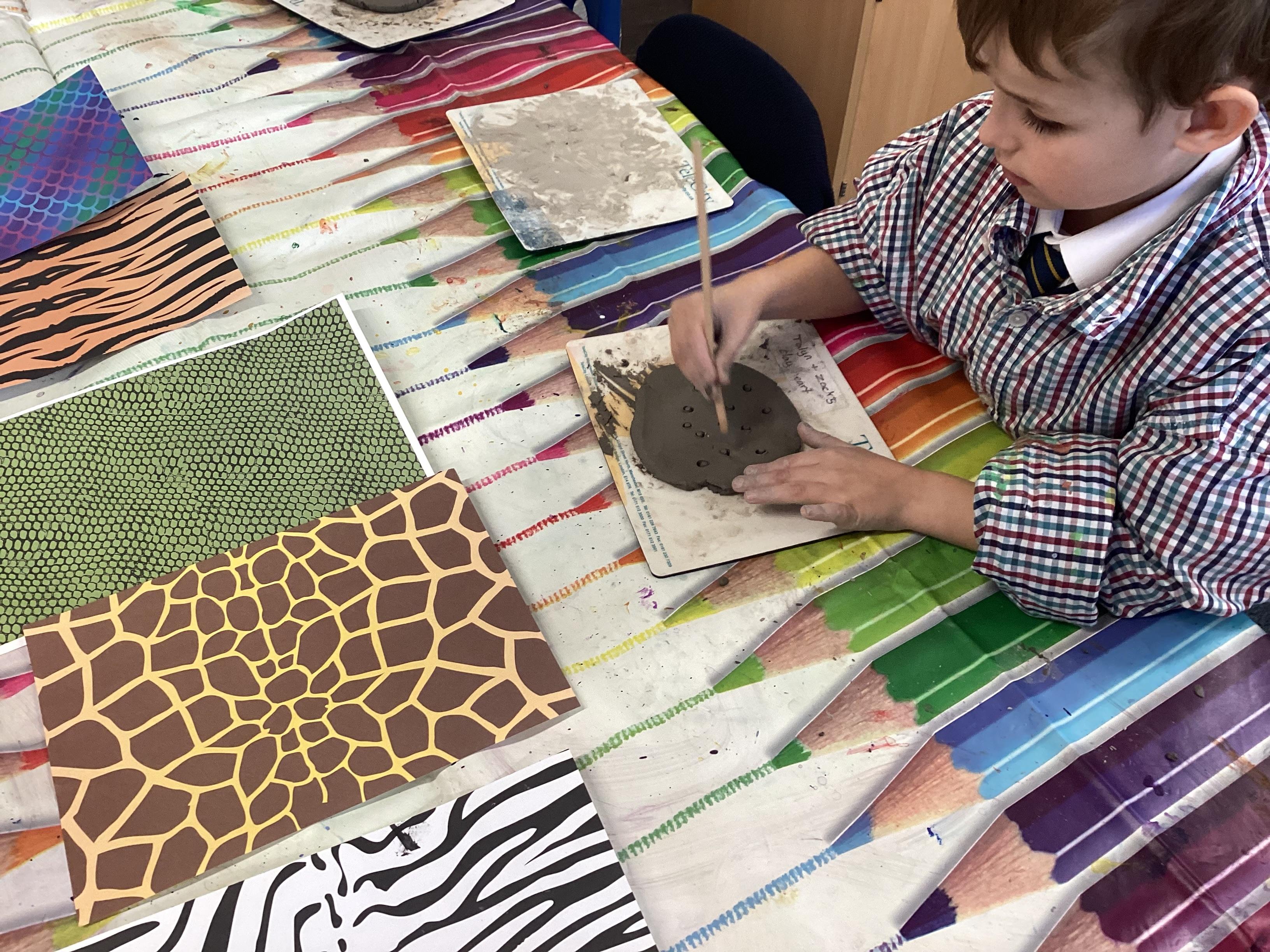 We have become artists and have started learning how to produce sculptures from clay. First we kneaded the clay, rolled a ball and flattened it out. We made a tile and then looked at different animal skin patterns. We used different tools to make patterns in the clay, lines, stripes, circles and lots of other shapes!
