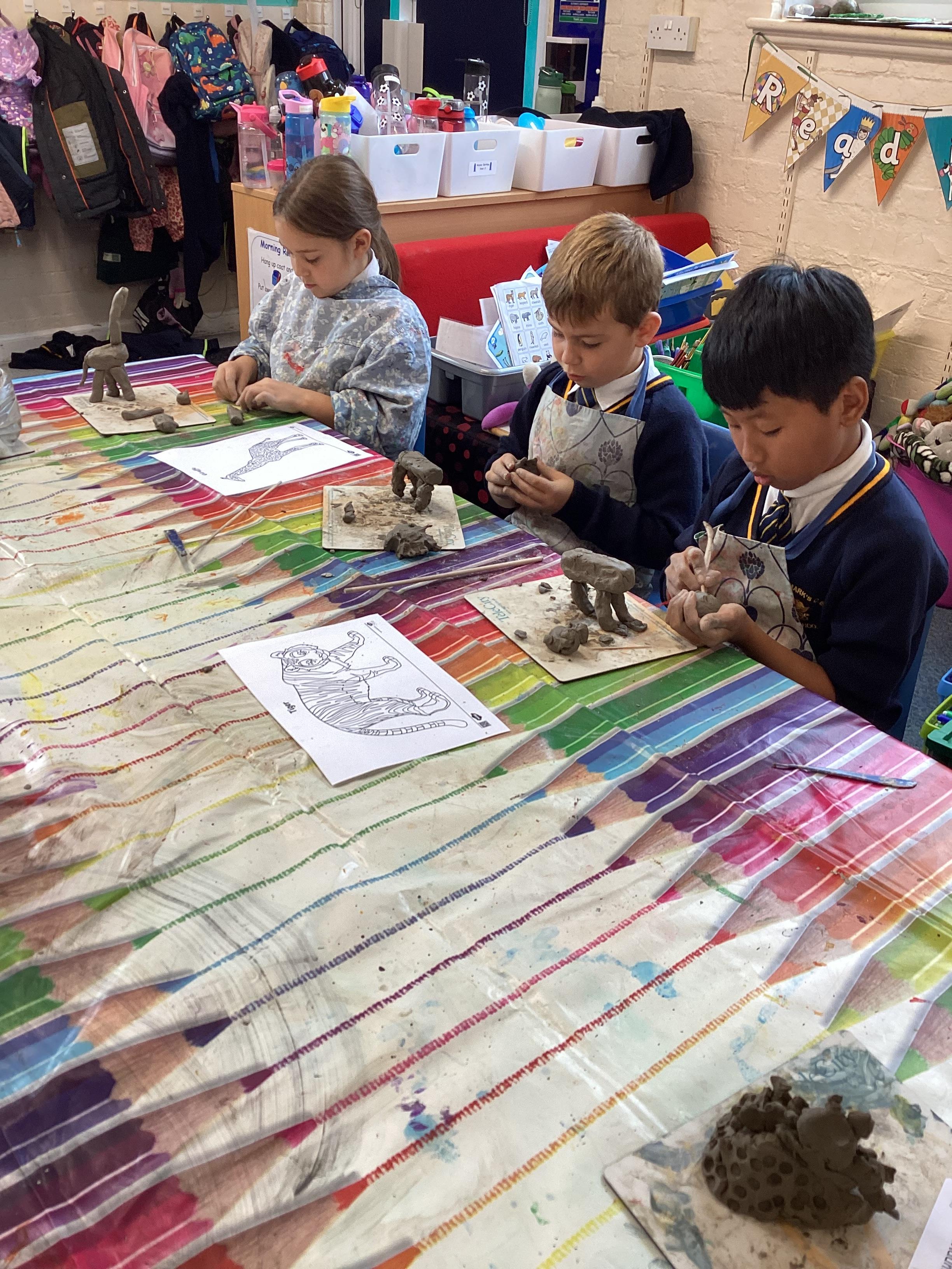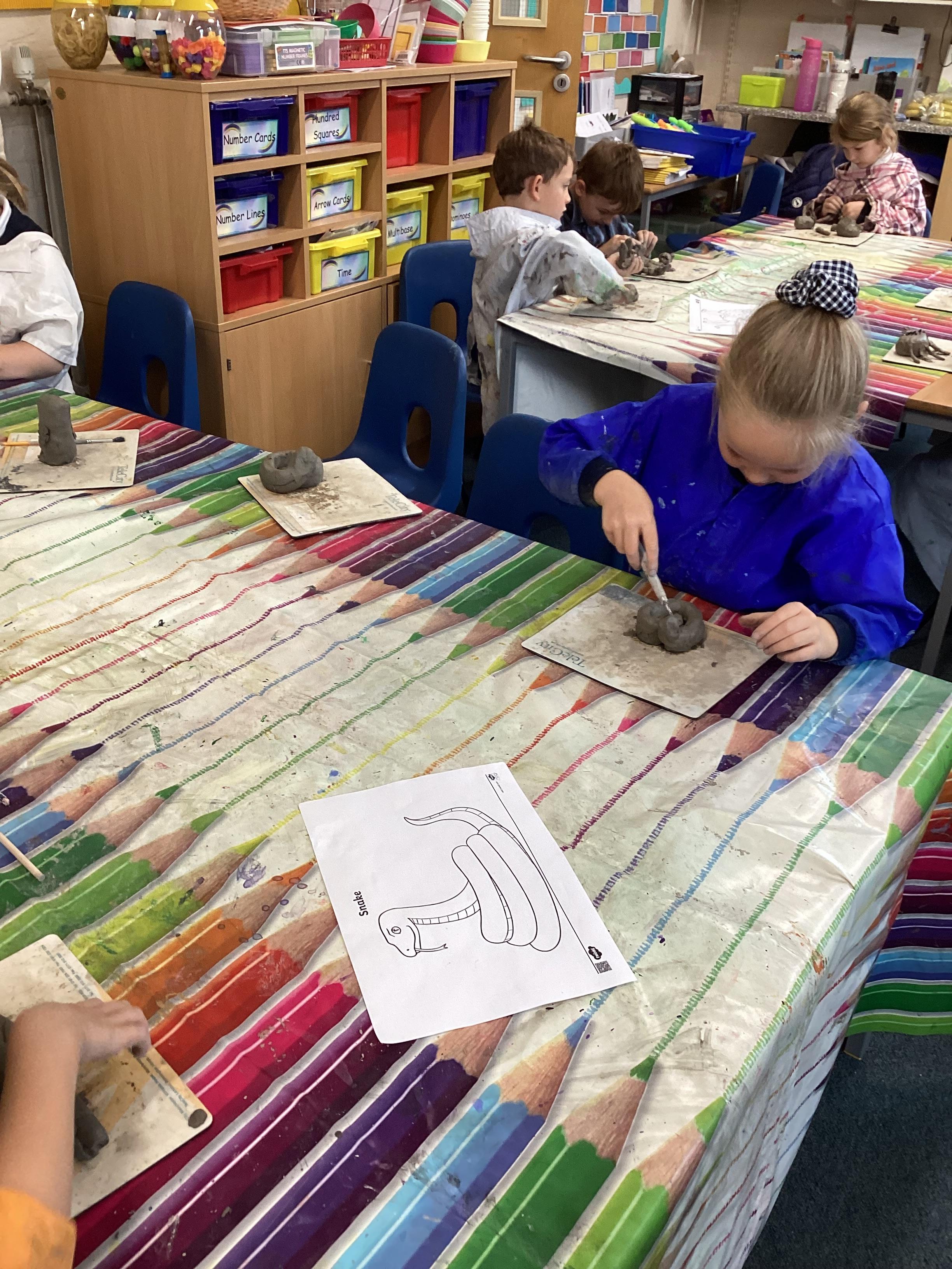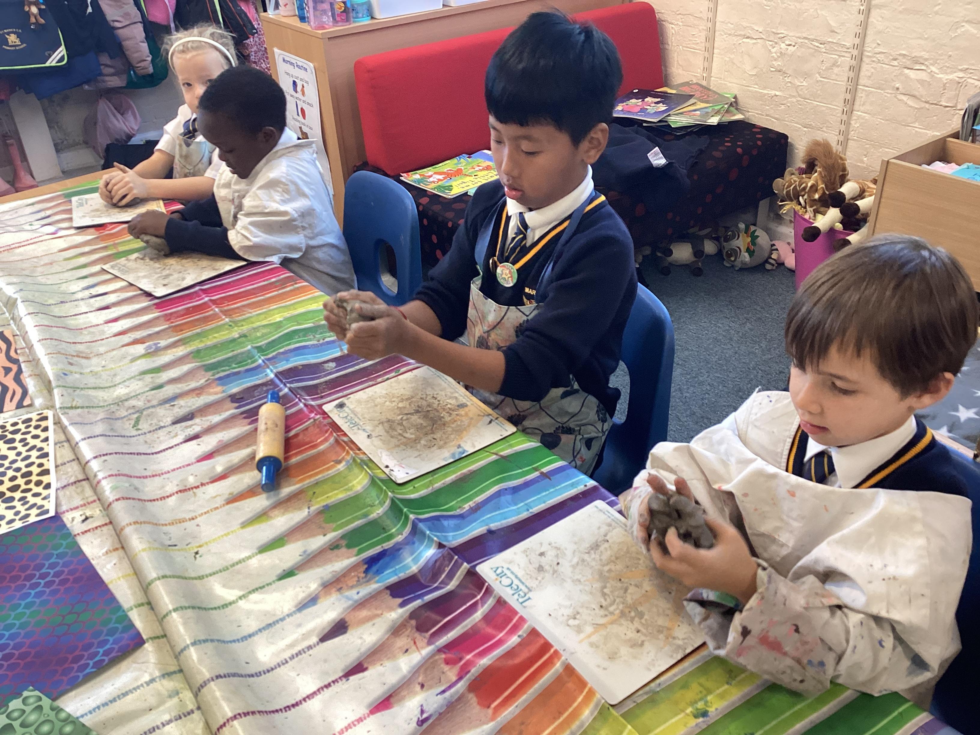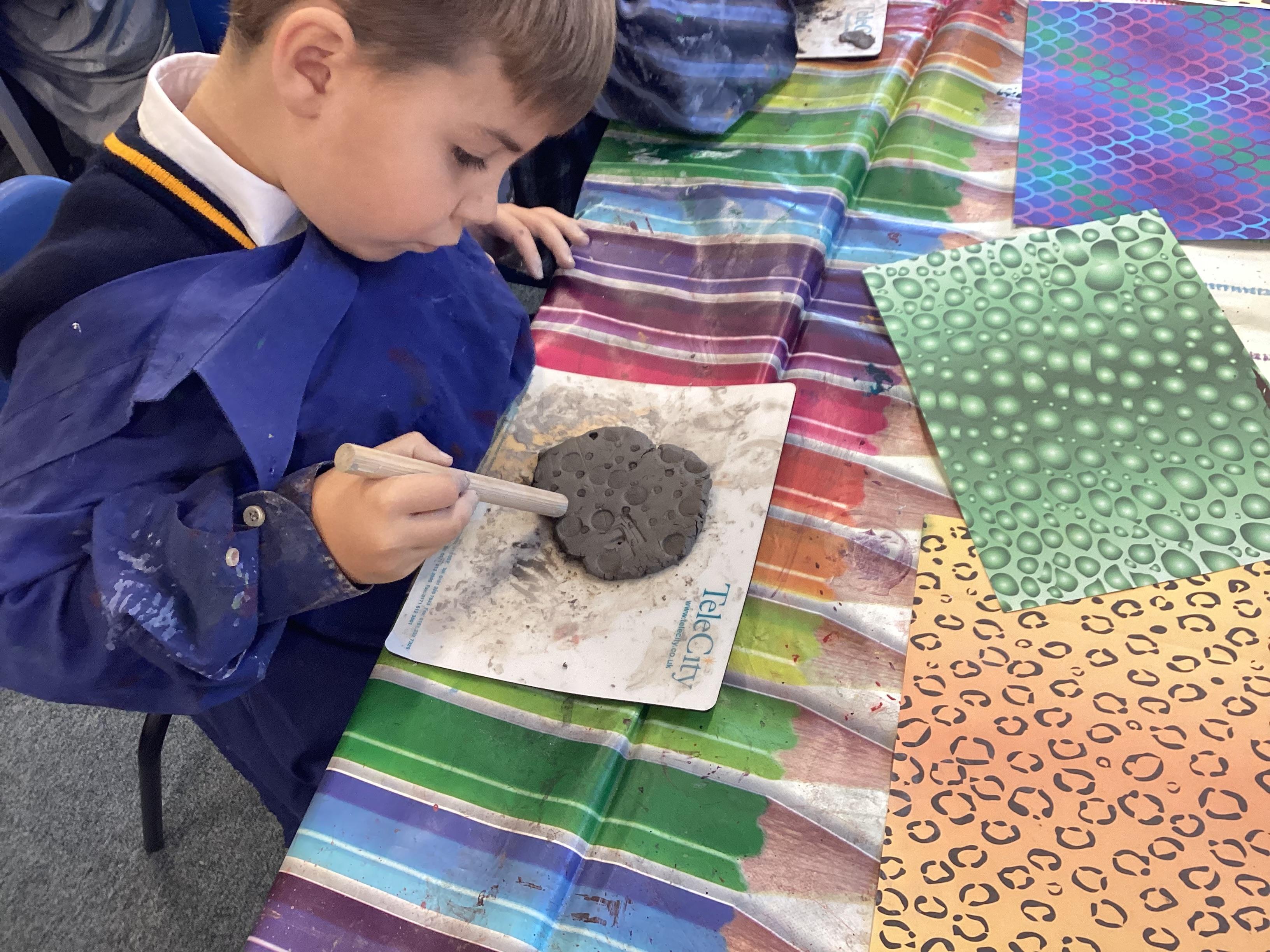 We have become artists and have started learning how to produce sculptures from clay. First we kneaded the clay, rolled a ball and flattened it out. We made a tile and then looked at different animal skin patterns. We used different tools to make patterns in the clay, lines, stripes, circles and lots of other shapes!