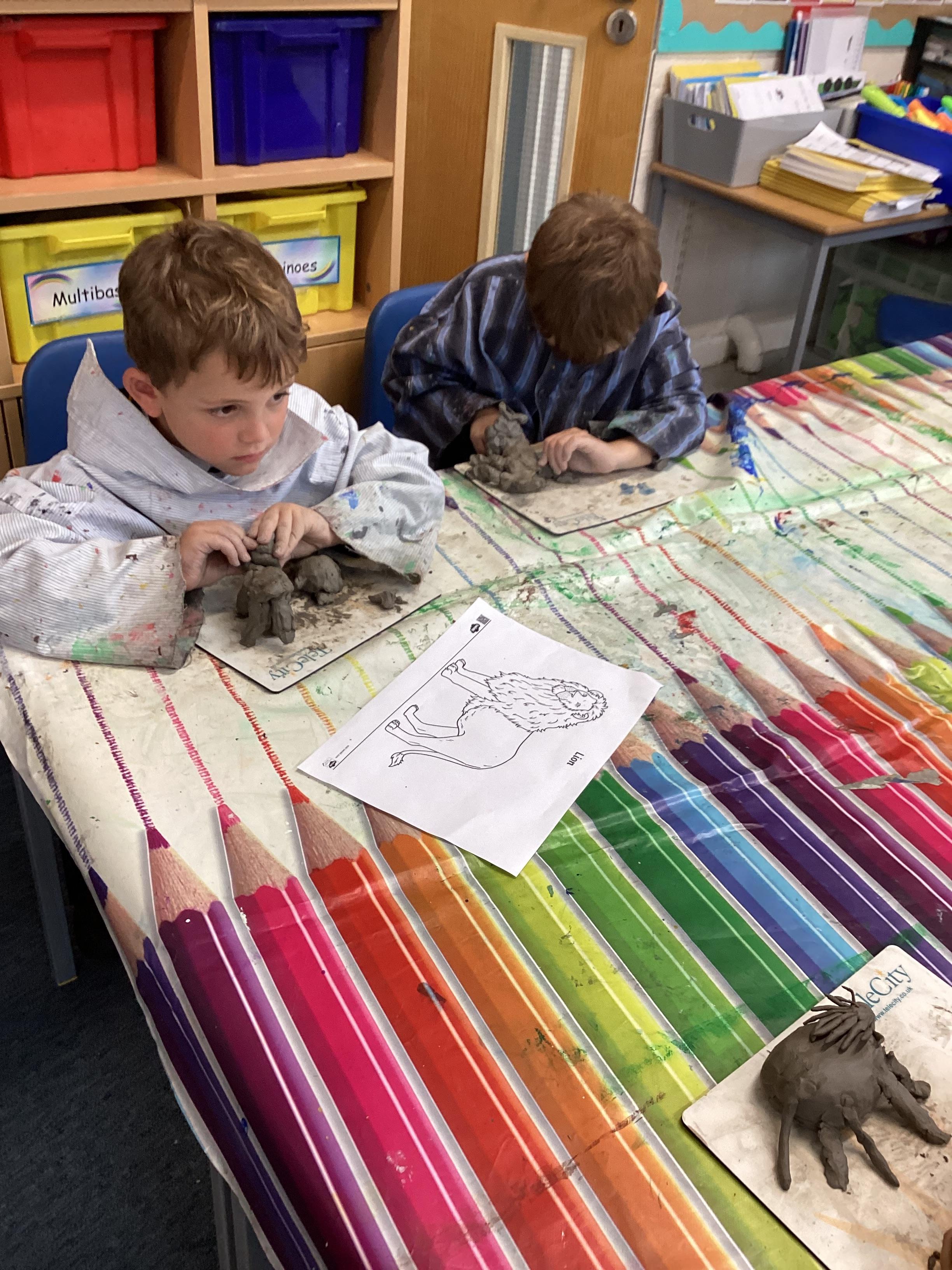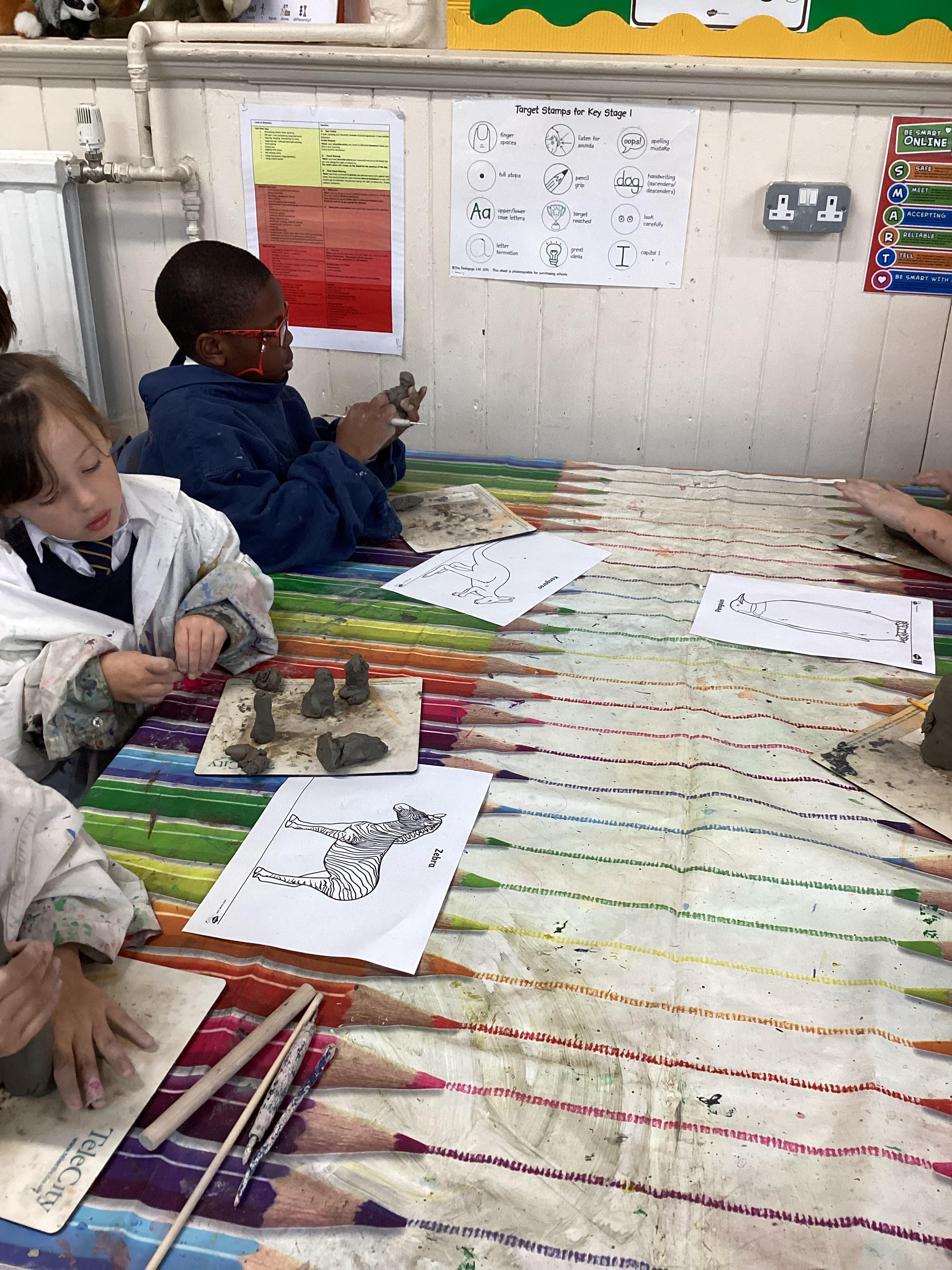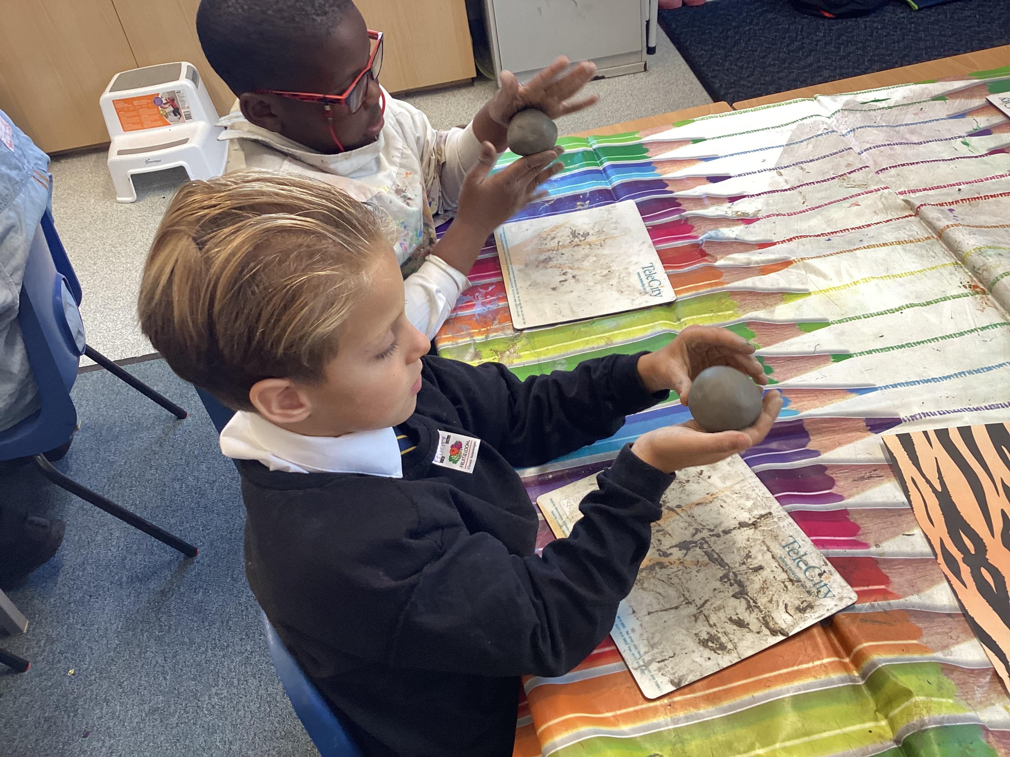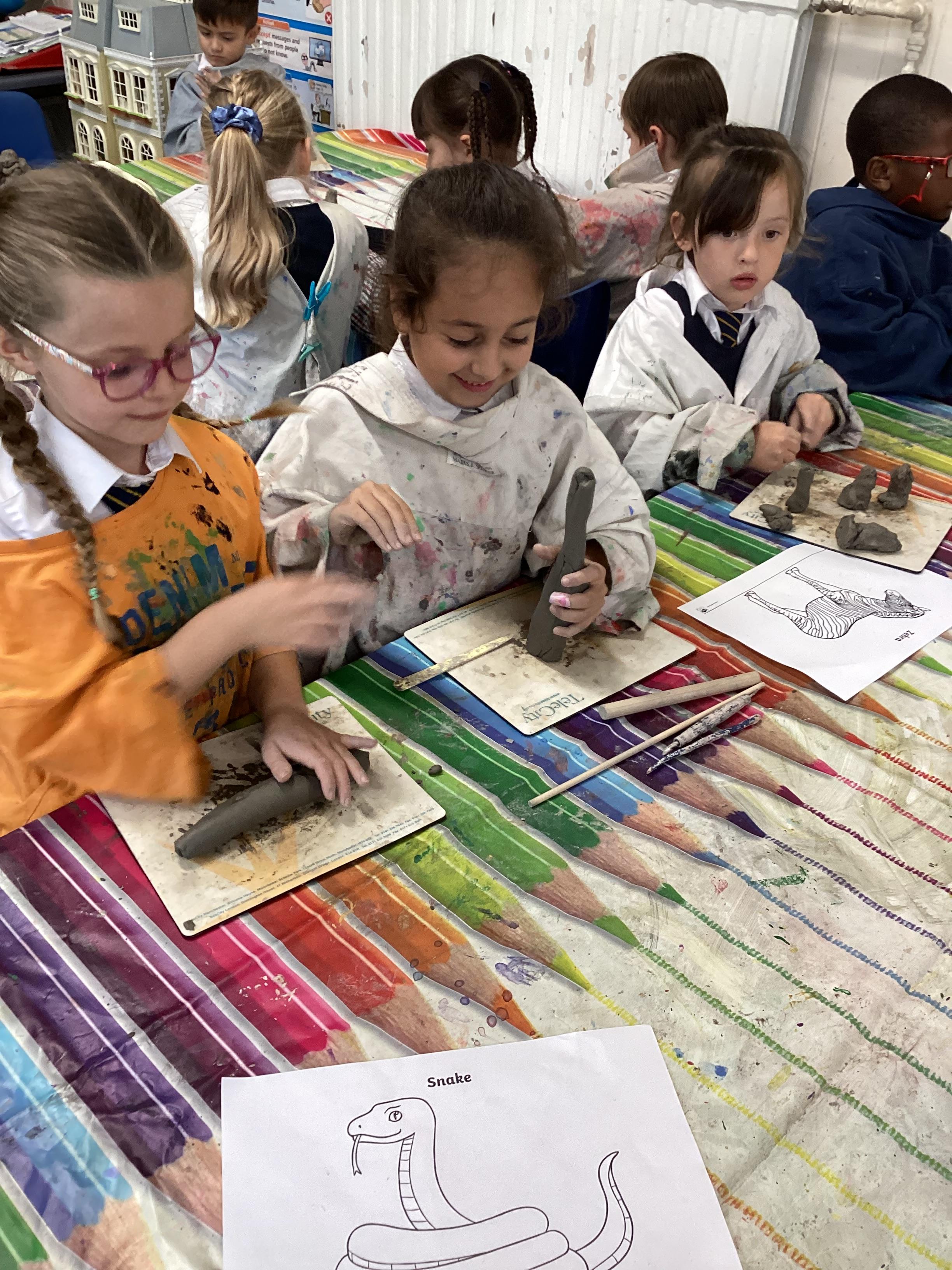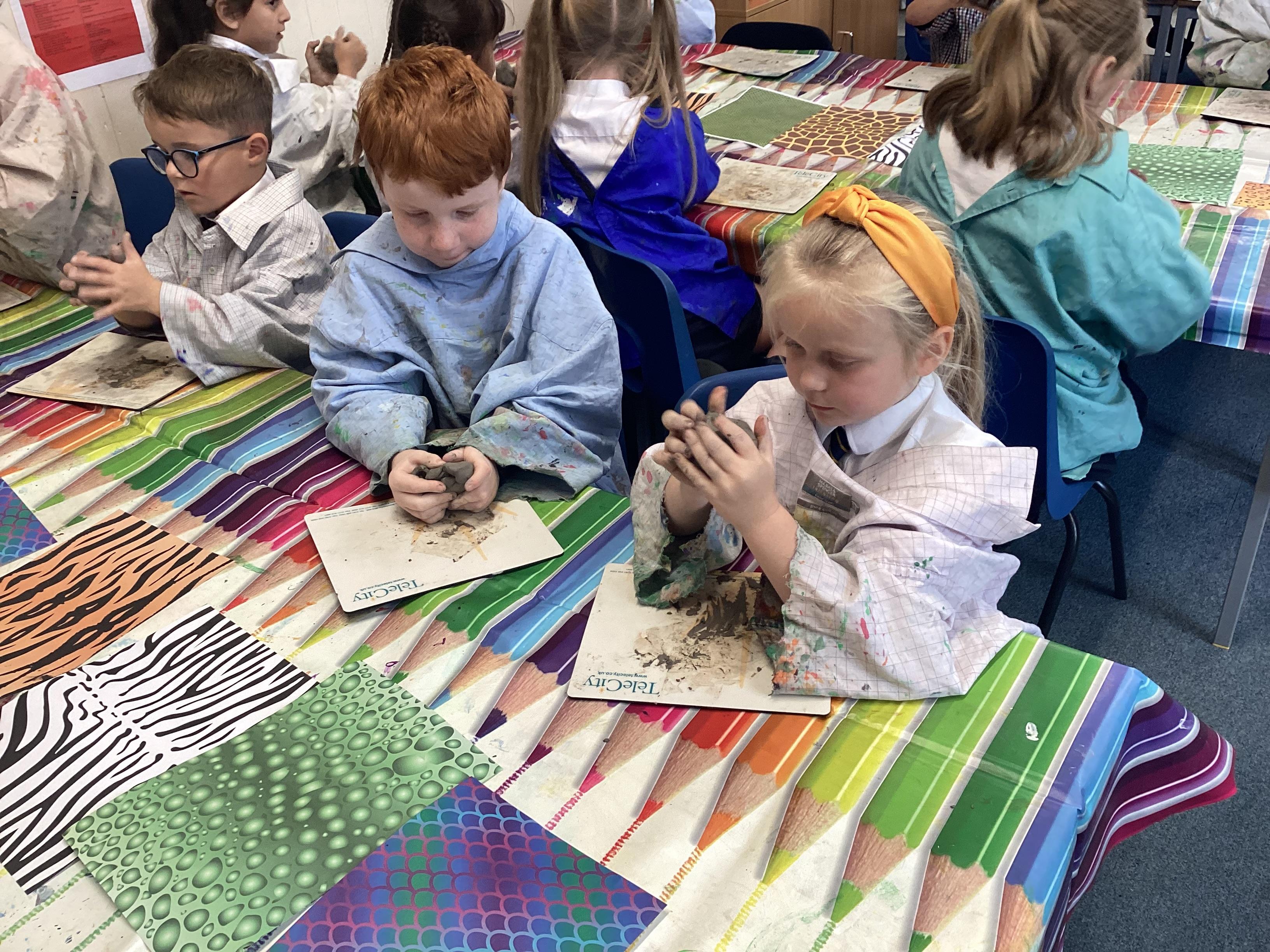 We have become artists and have started learning how to produce sculptures from clay. First we kneaded the clay, rolled a ball and flattened it out. We made a tile and then looked at different animal skin patterns. We used different tools to make patterns in the clay, lines, stripes, circles and lots of other shapes!